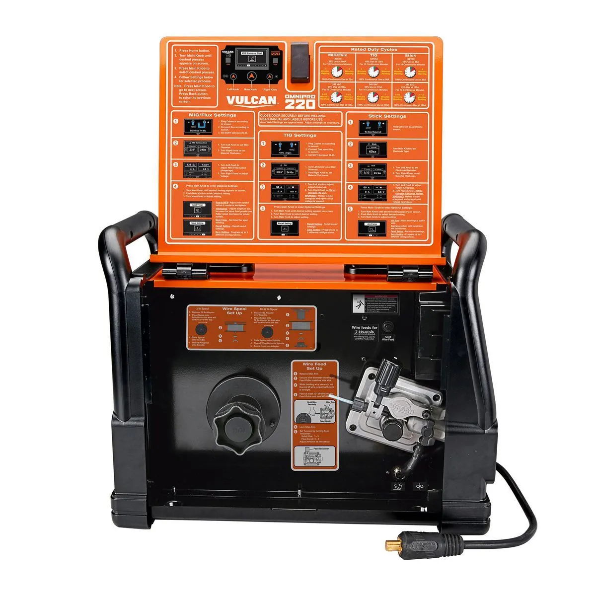 The Vulcan OmniPro 220 is a multiprocess welding system sold by Harbor Freight. Four welding processes (MIG, Flux-Cored, TIG, Stick), dual voltage input (120V/240V), LCD synergic controls. Its owner's manual is 48 pages of dense technical content: duty cycle matrices, polarity setup procedures, wire feed mechanisms, wiring schematics, troubleshooting tables, and weld diagnosis diagrams.